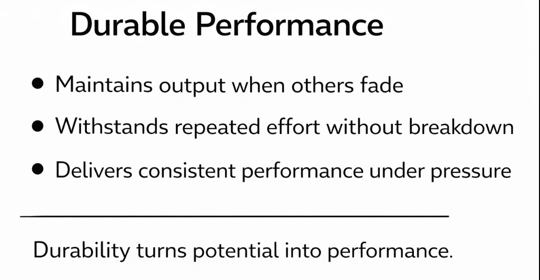 Durability is what allows performance to show up consistently under fatigue, pressure, and repeated effort.